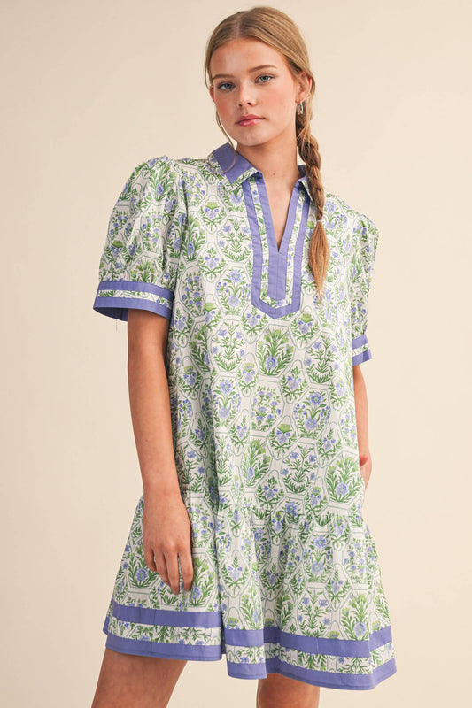FLORAL PUFF SLEEVE DROP WAIST MINI DRESS