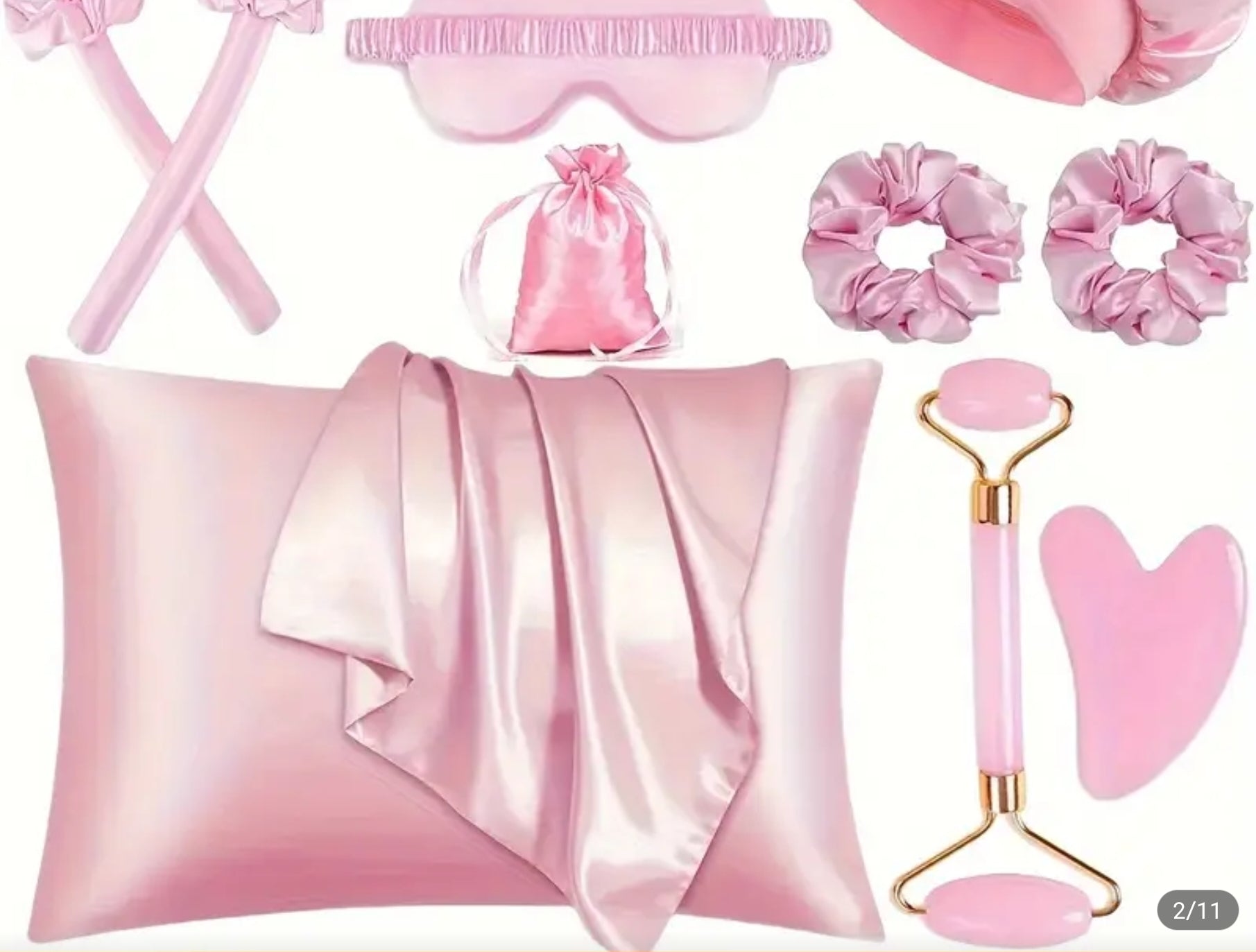 Discover the 12 pcs Women’s Sleep Set, designed to support your nightly beauty routine with expert care. This comprehensive collection includes curling tools to create gentle waves without heat, a facial massager to enhance circulation, a soft sleep mask for restful, undisturbed sleep, a comfortable hairband, and a satin pillow cover that helps reduce hair breakage and skin creases. Each piece works together to promote healthier hair and skin while you rest, making it an essential addition for effortless overnight styling and rejuvenation.